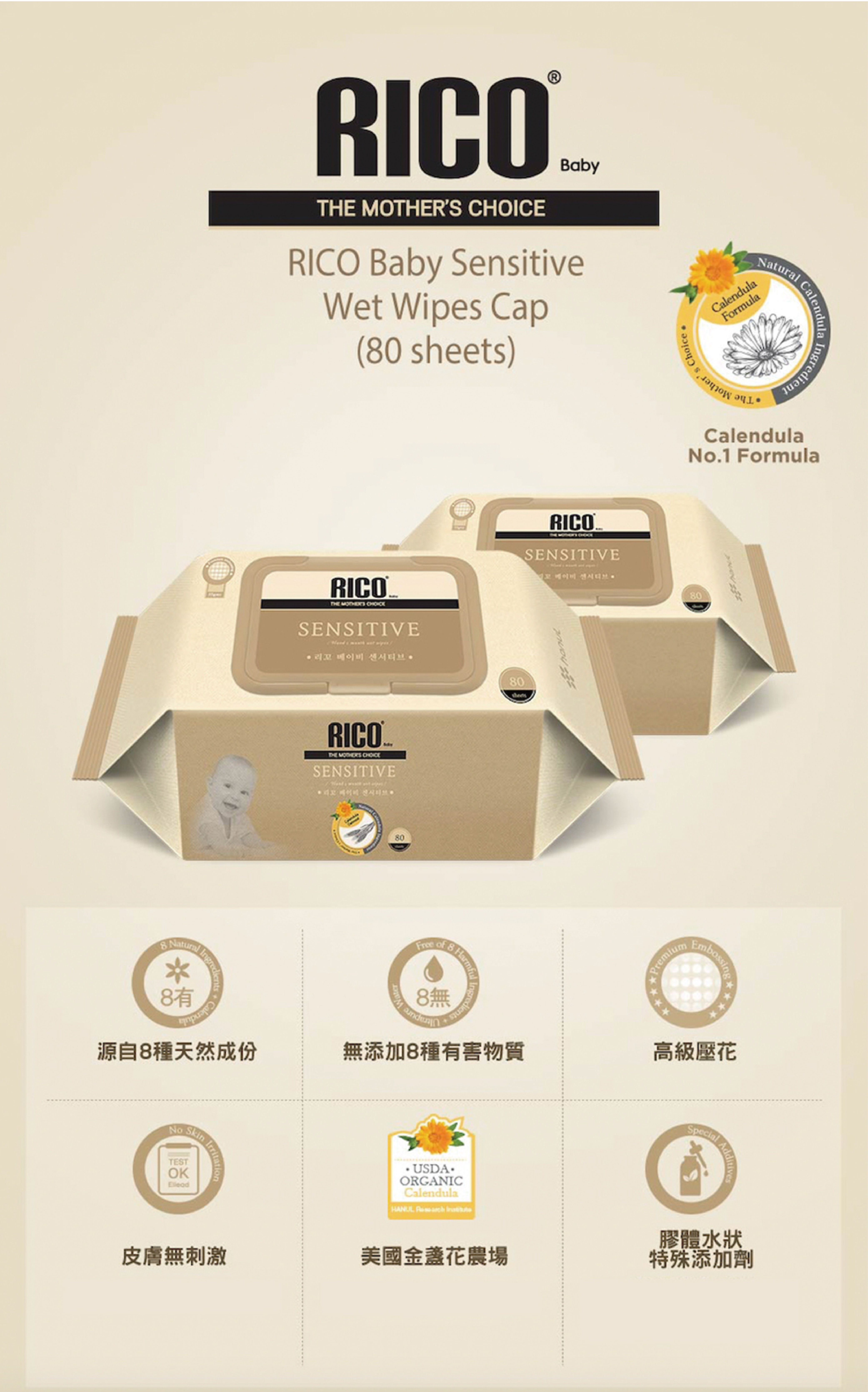 *RICO濕巾: 採用高壓水工藝,質感厚實細緻。結合有機金盞花與植萃成分,大藍(保濕)、大黃(潔膚)、大綠(滋潤)三款滿足不同清潔需求。