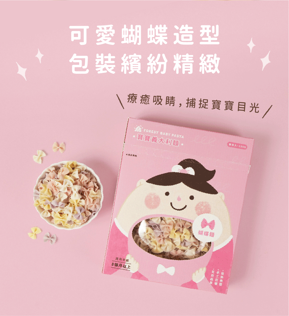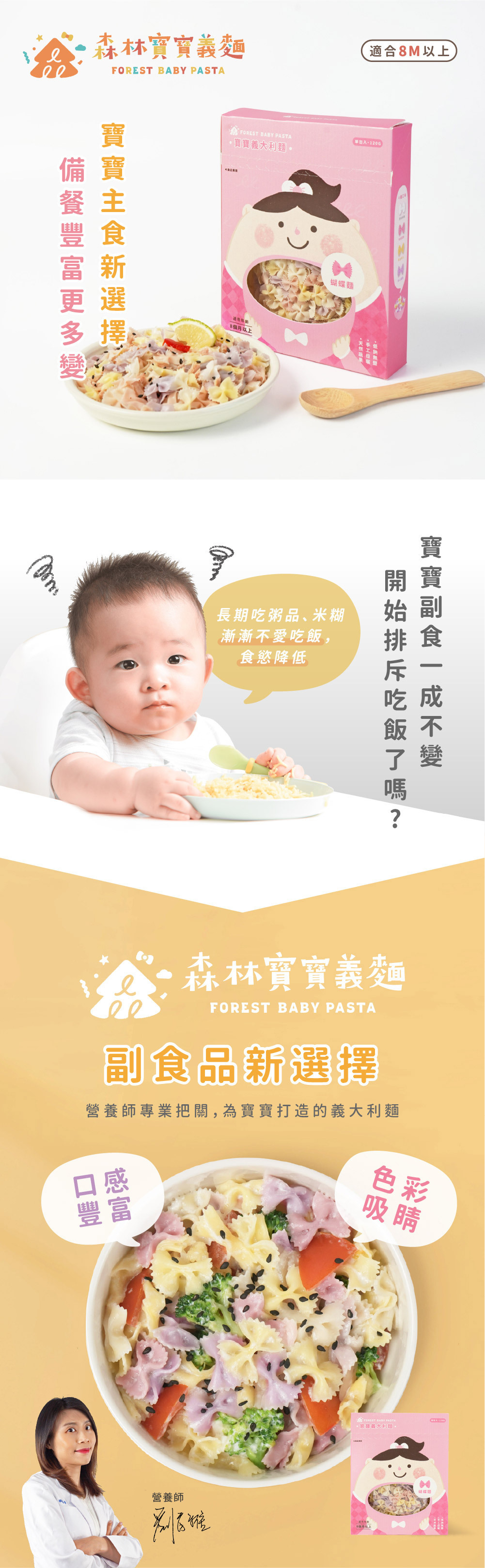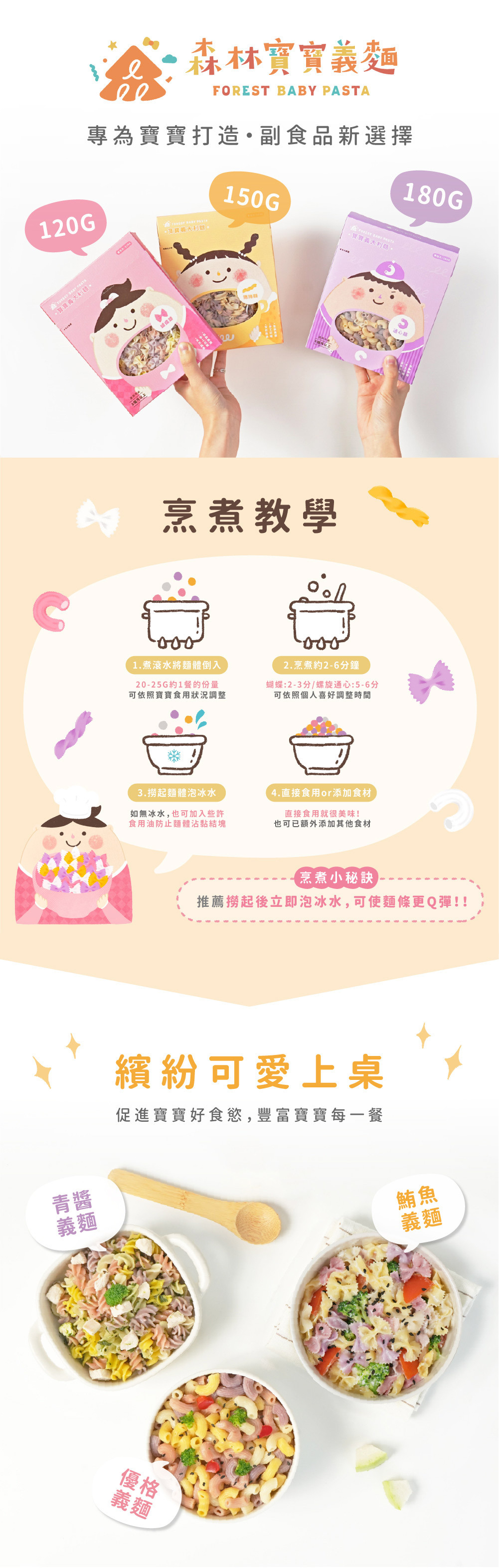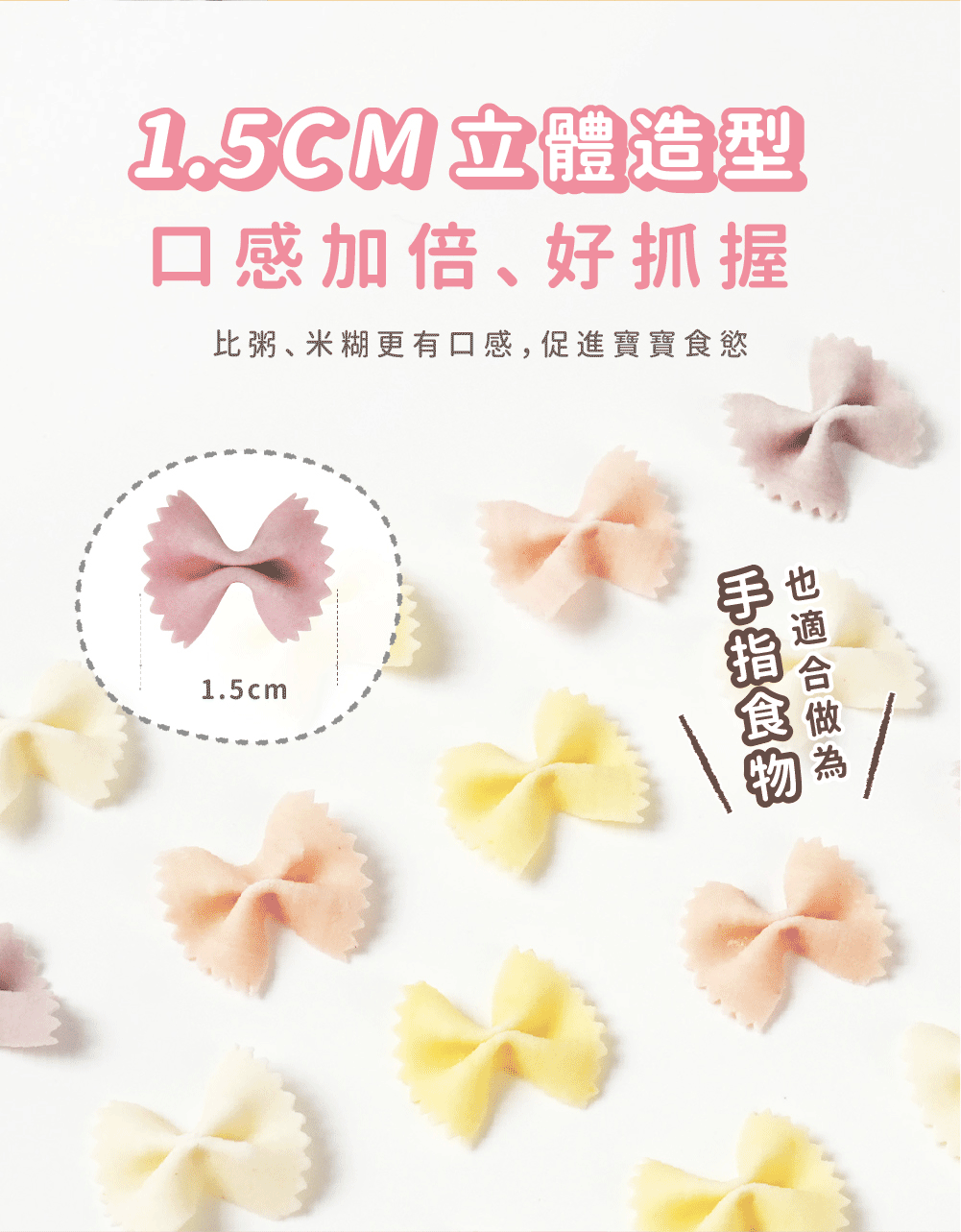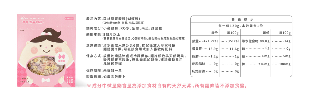 產品內容|森林寶寶義麵(蝴蝶麵)(口味:原味無鹽、紫薯、南瓜、甜菜根)