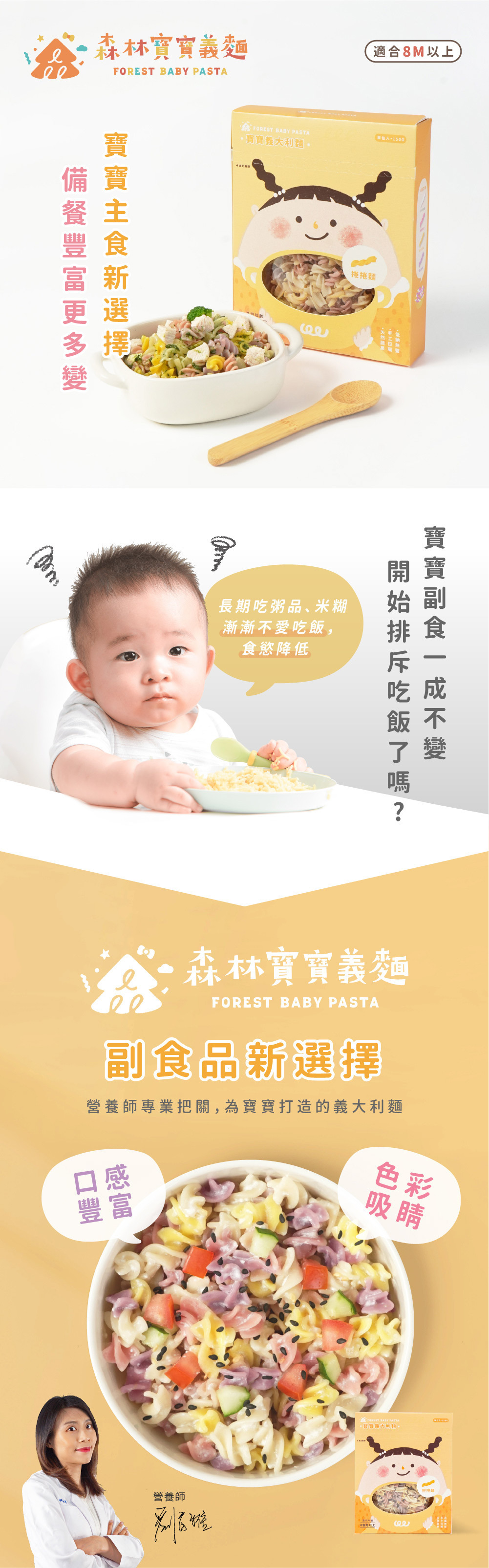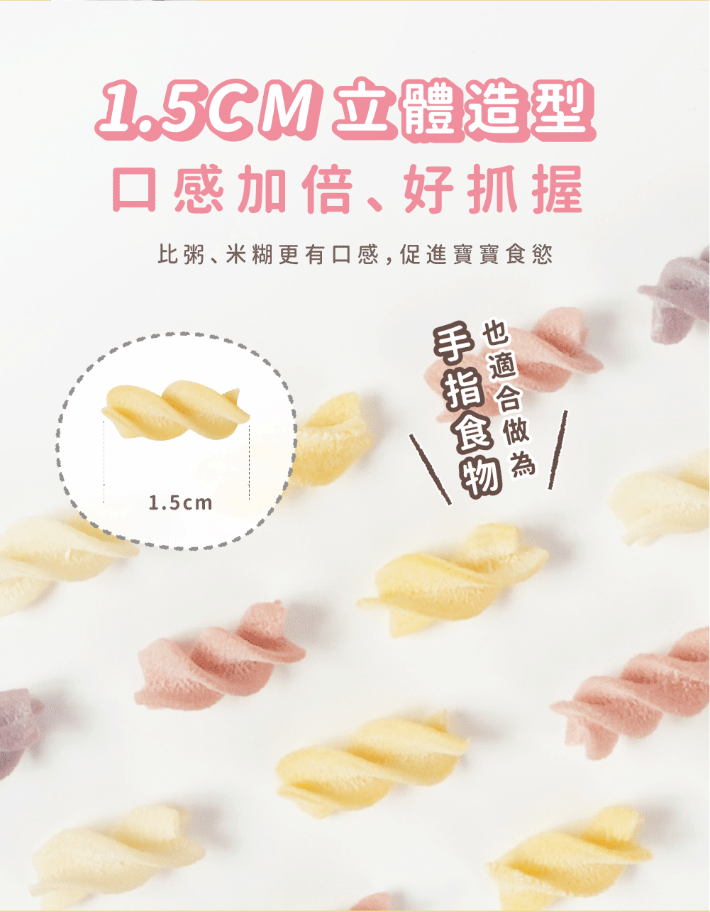 產品內容|森林寶寶義麵(捲捲麵)(口味:原味無鹽、紫薯、南瓜、甜菜根)