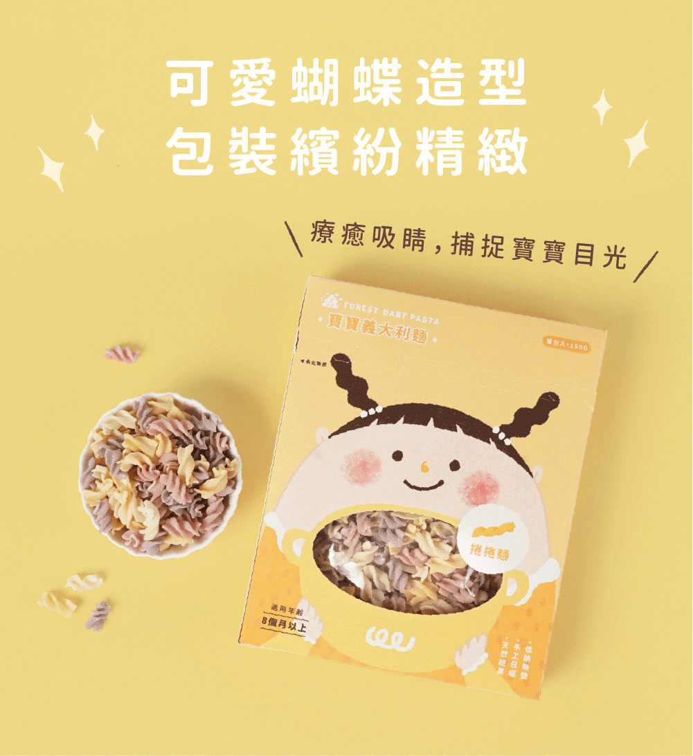 寶寶義麵完全使用天然作物調色而成,絕無色素、無化學加工物、無防腐劑,