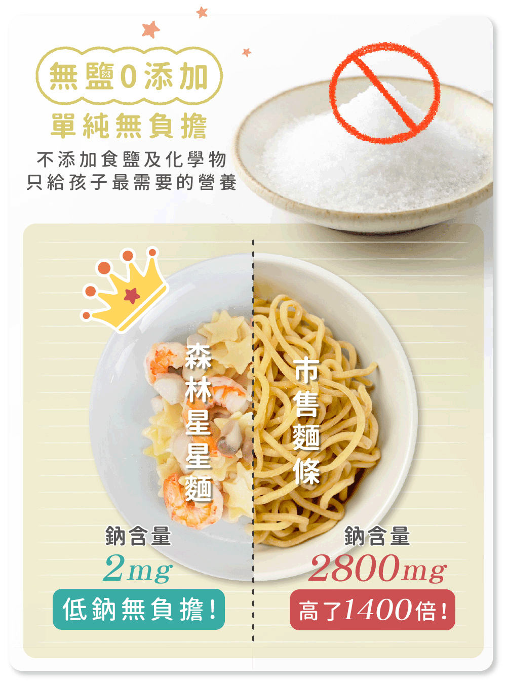 寶寶每日所需的鈉含量必須低於200毫克,而星星麵的鈉含量來自食材本身約只有2毫克且完全無鹽呦!