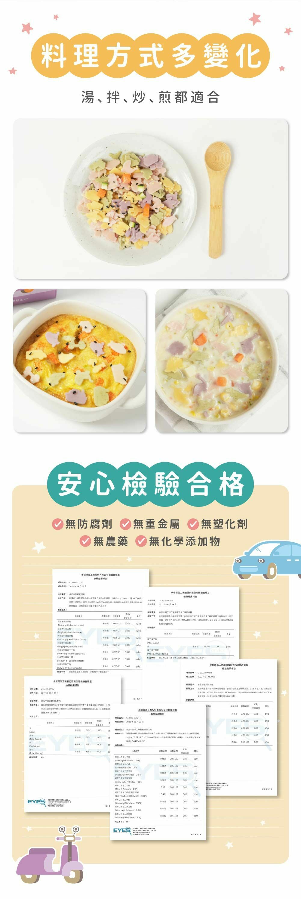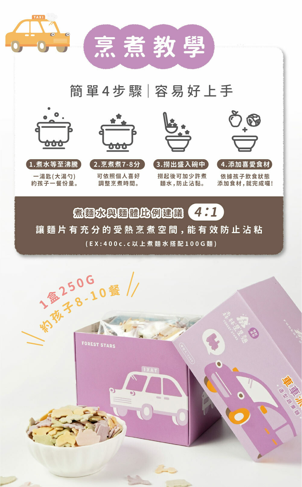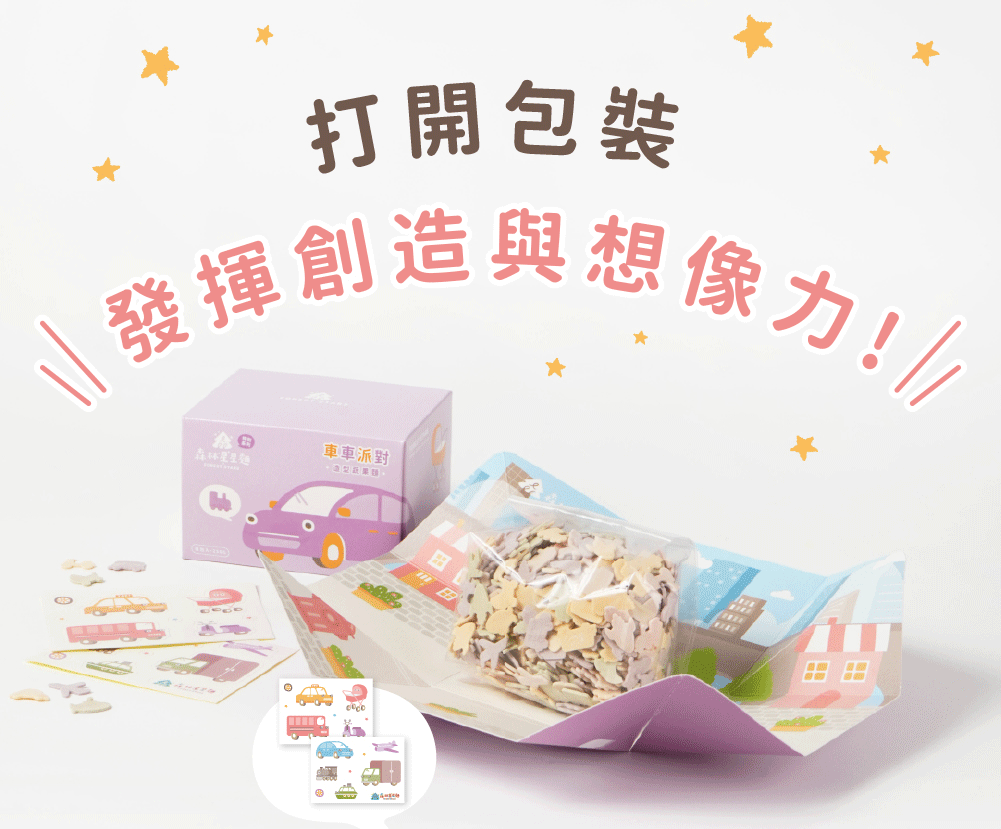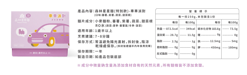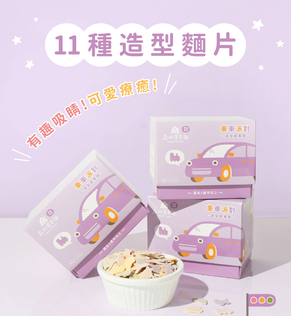產品內容|特別款星星麵-車車派對(口味:蕃薯、紫薯、蔬菜、甜菜根)