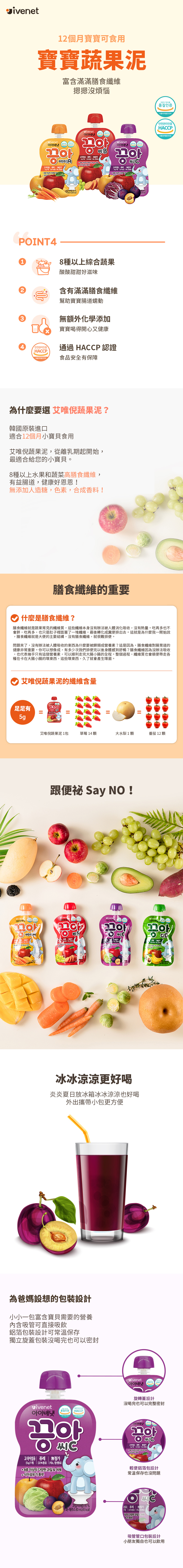 艾唯倪蔬果泥:12month適用,8種以上水果和蔬菜高膳食纖維5g/袋,有益腸道健康好恩恩,無添加人造糖,色素,合成香料!