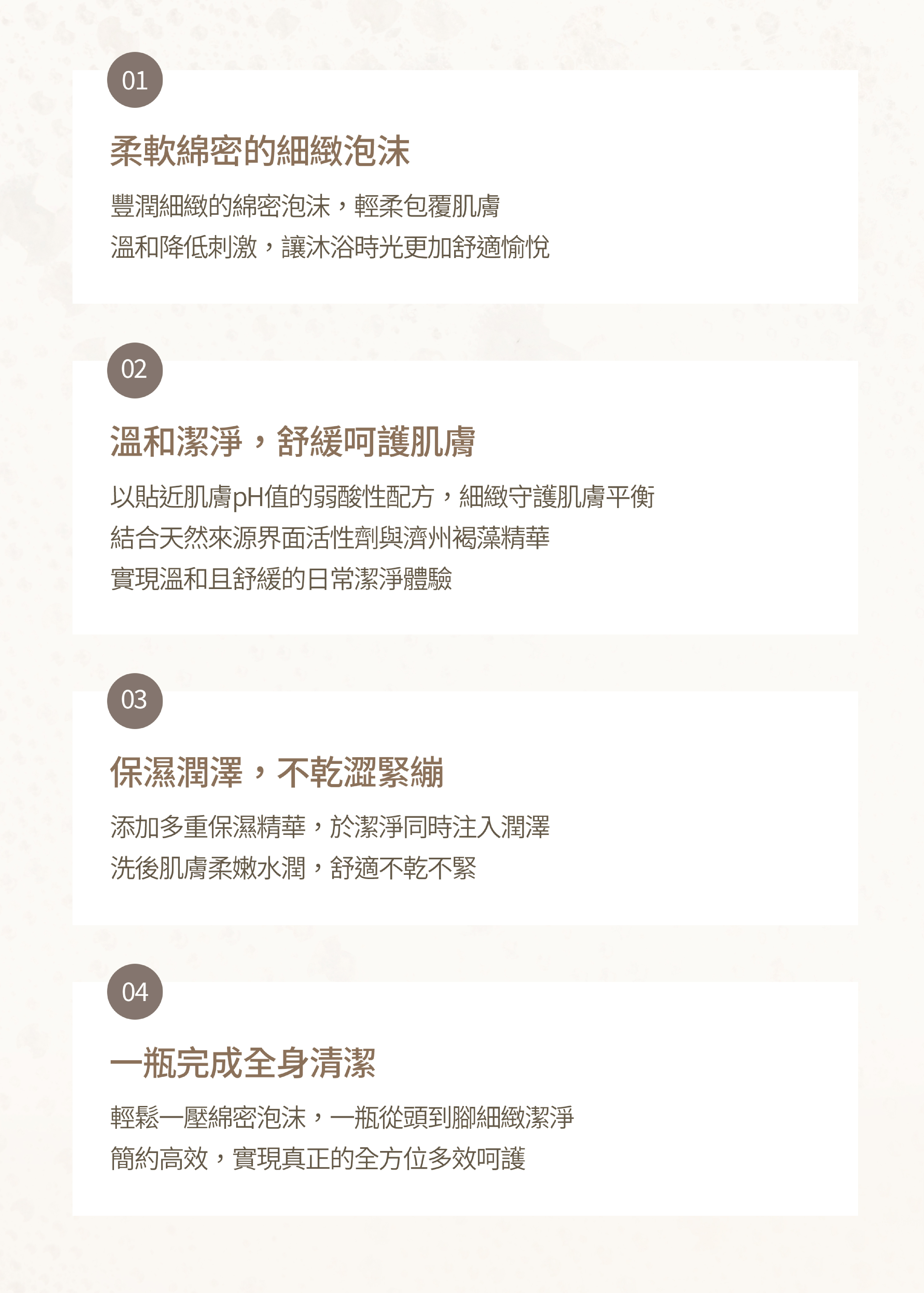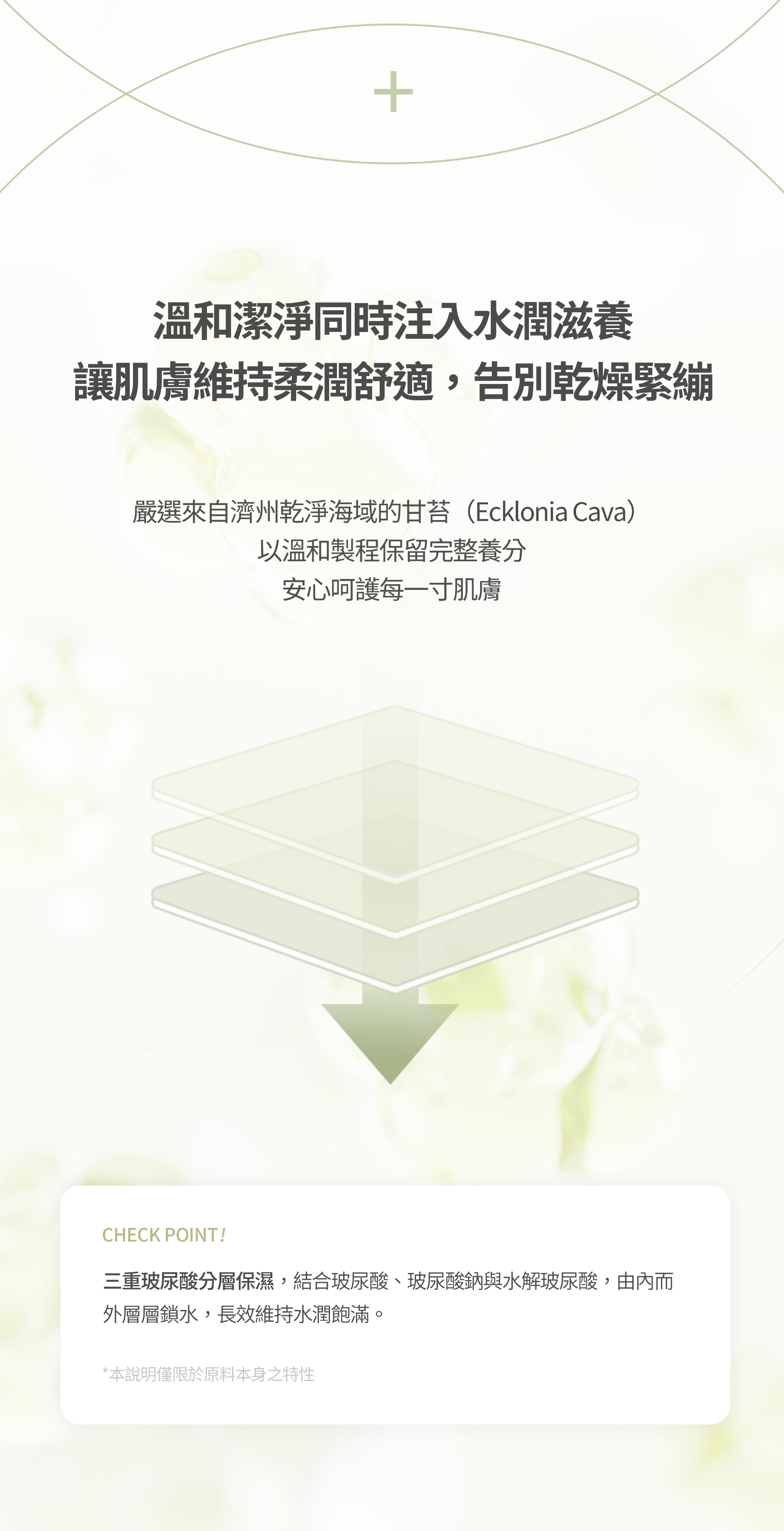 搭配濟州甘苔萃取與多重玻尿酸,洗後不乾澀,保留肌膚水潤感。