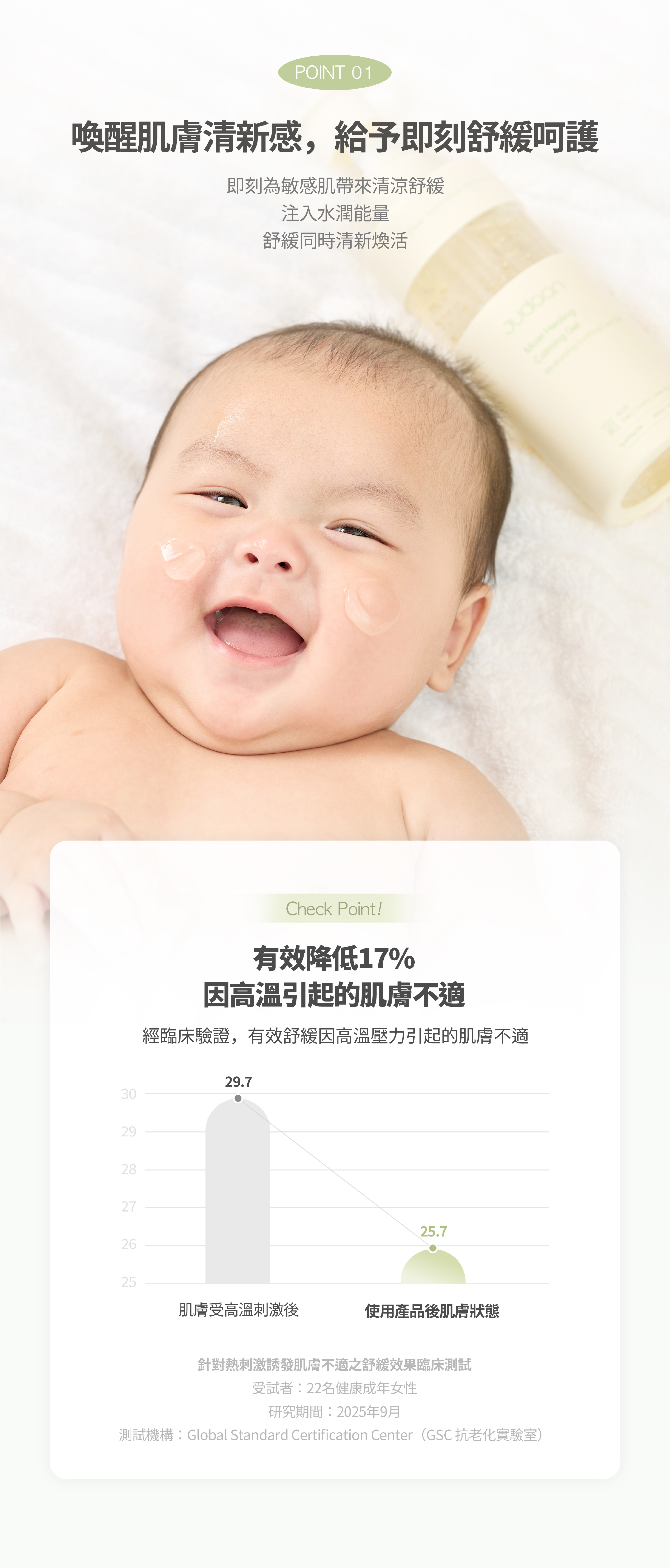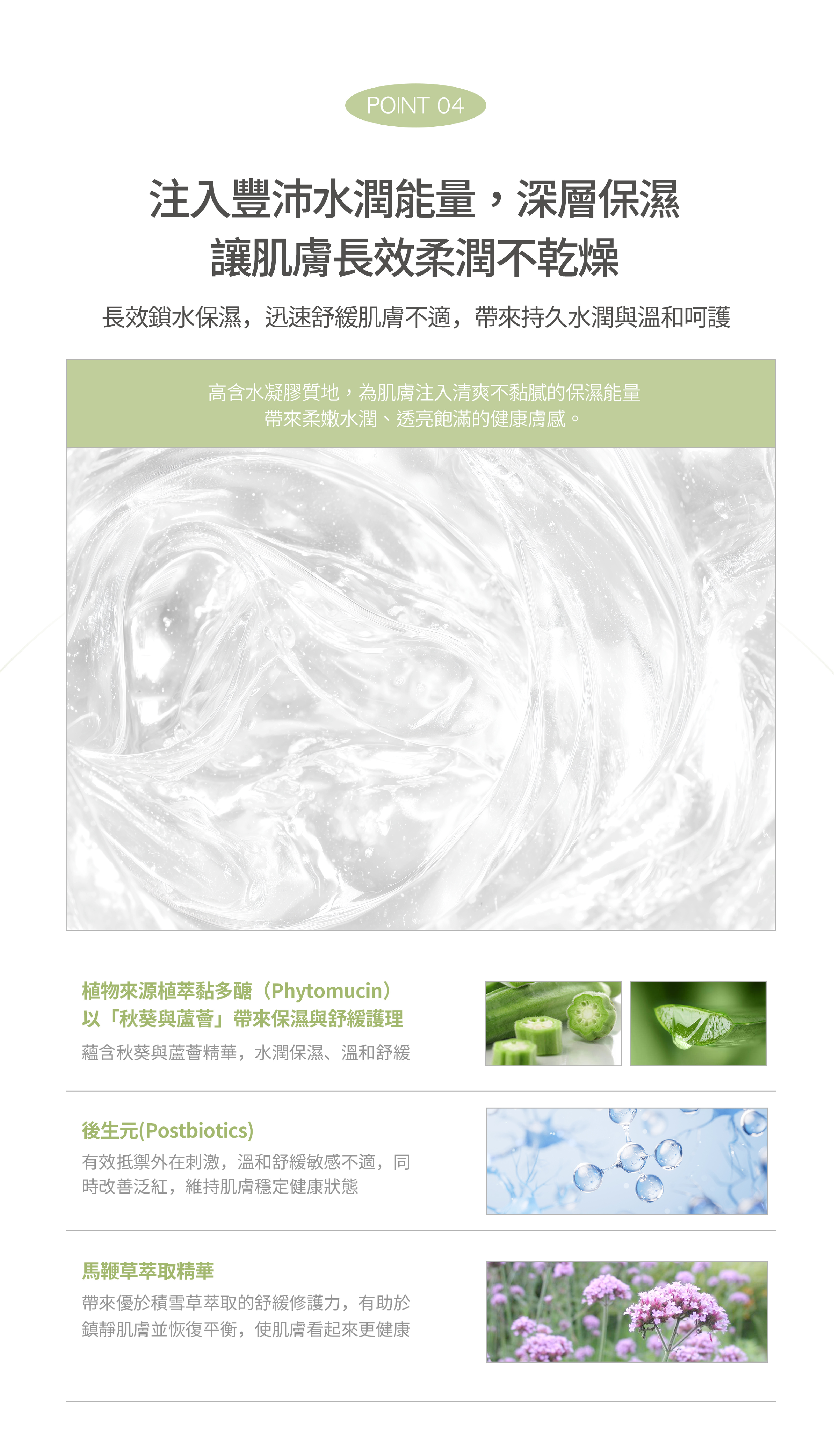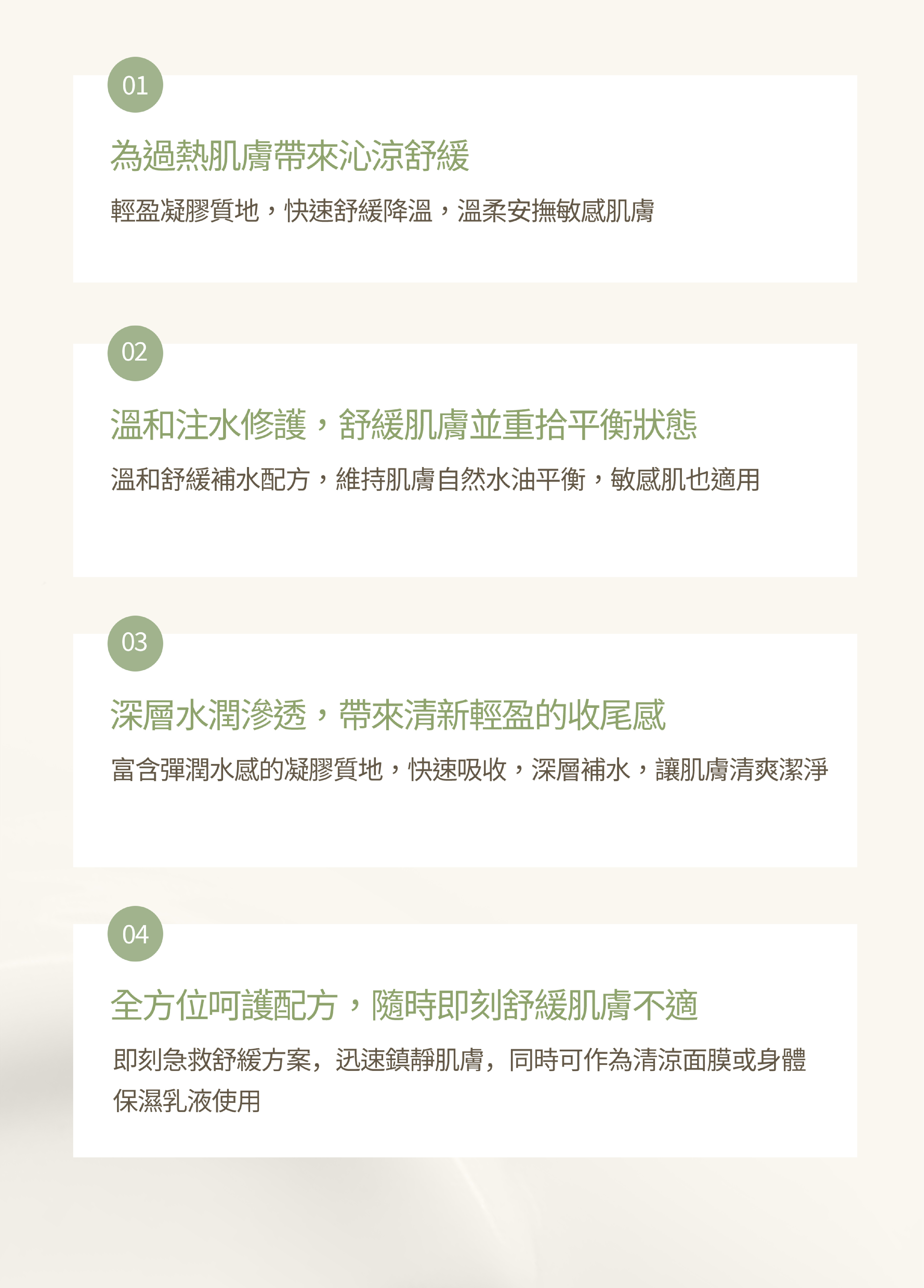 清爽涼感質地能迅速安撫因外在環境造成的泛紅、發熱與不適感,提供即時舒緩修護。