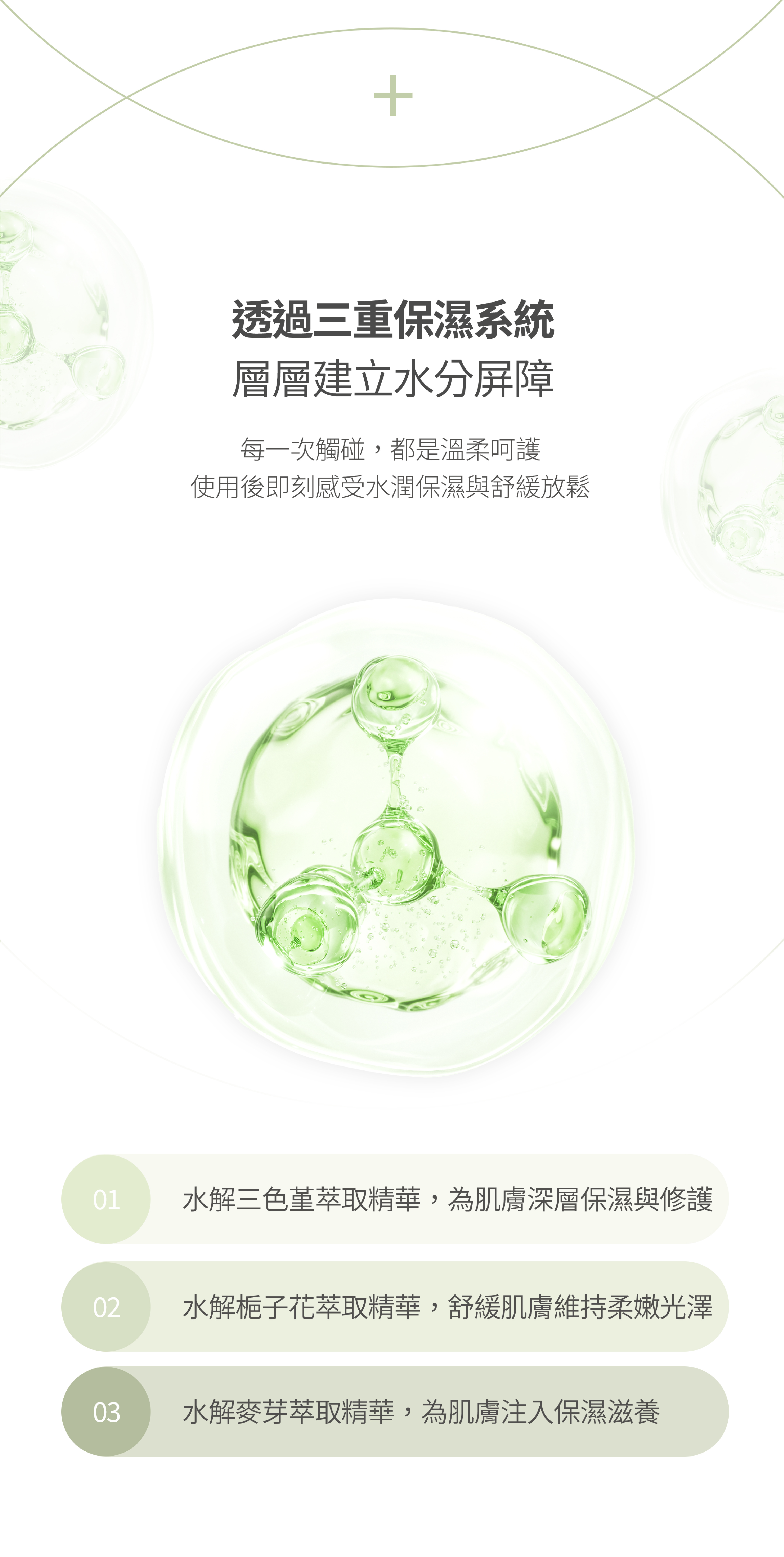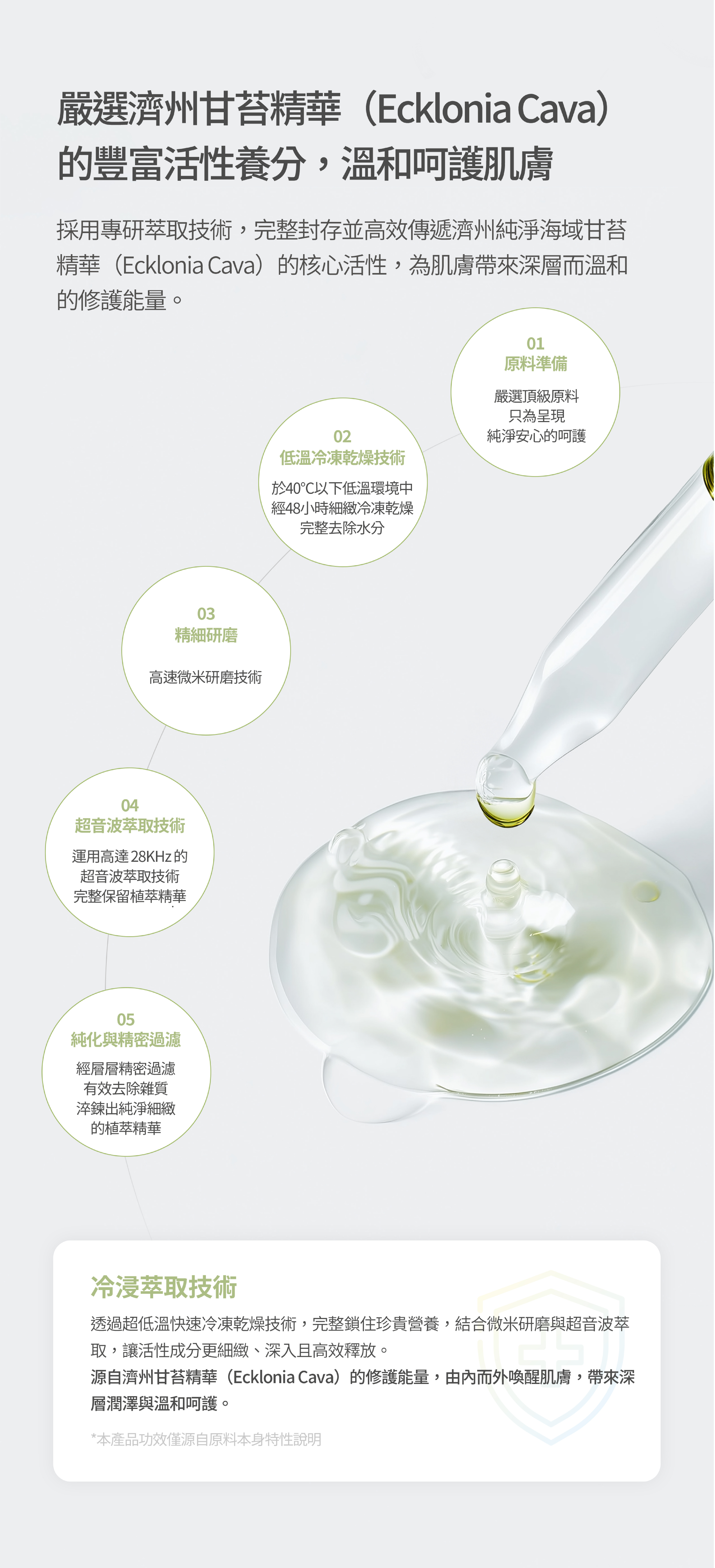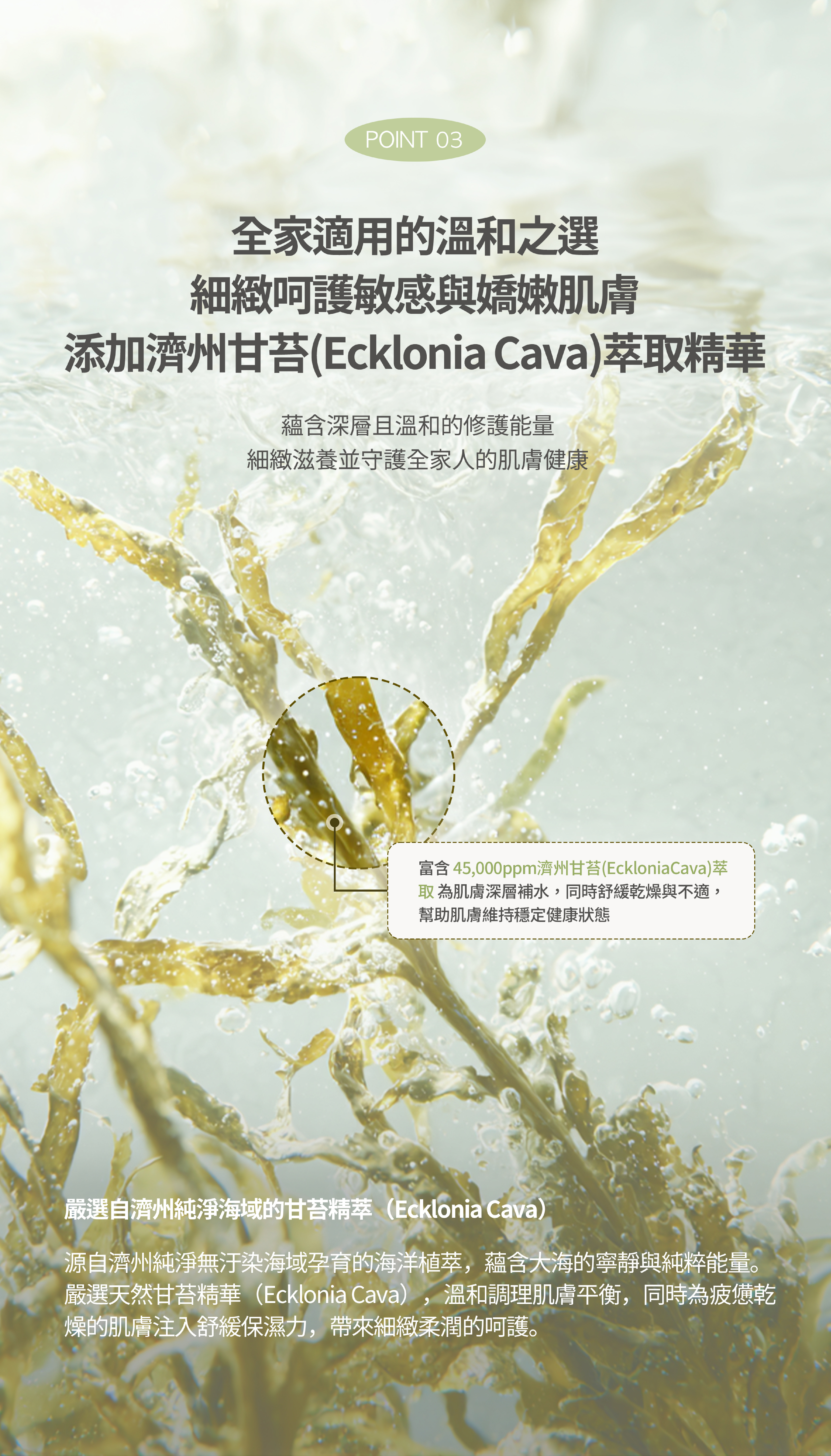 添加高濃度濟州甘苔萃取與多重修護成分,邊鎮靜、邊補水,讓肌膚恢復柔軟與穩定。