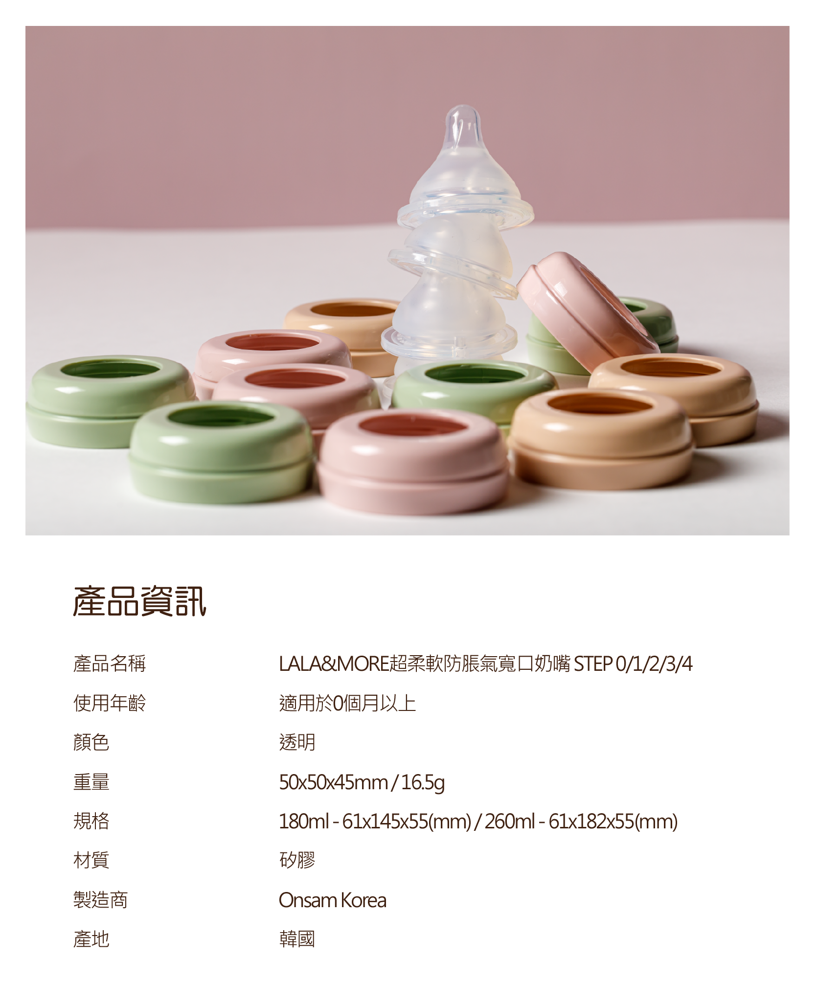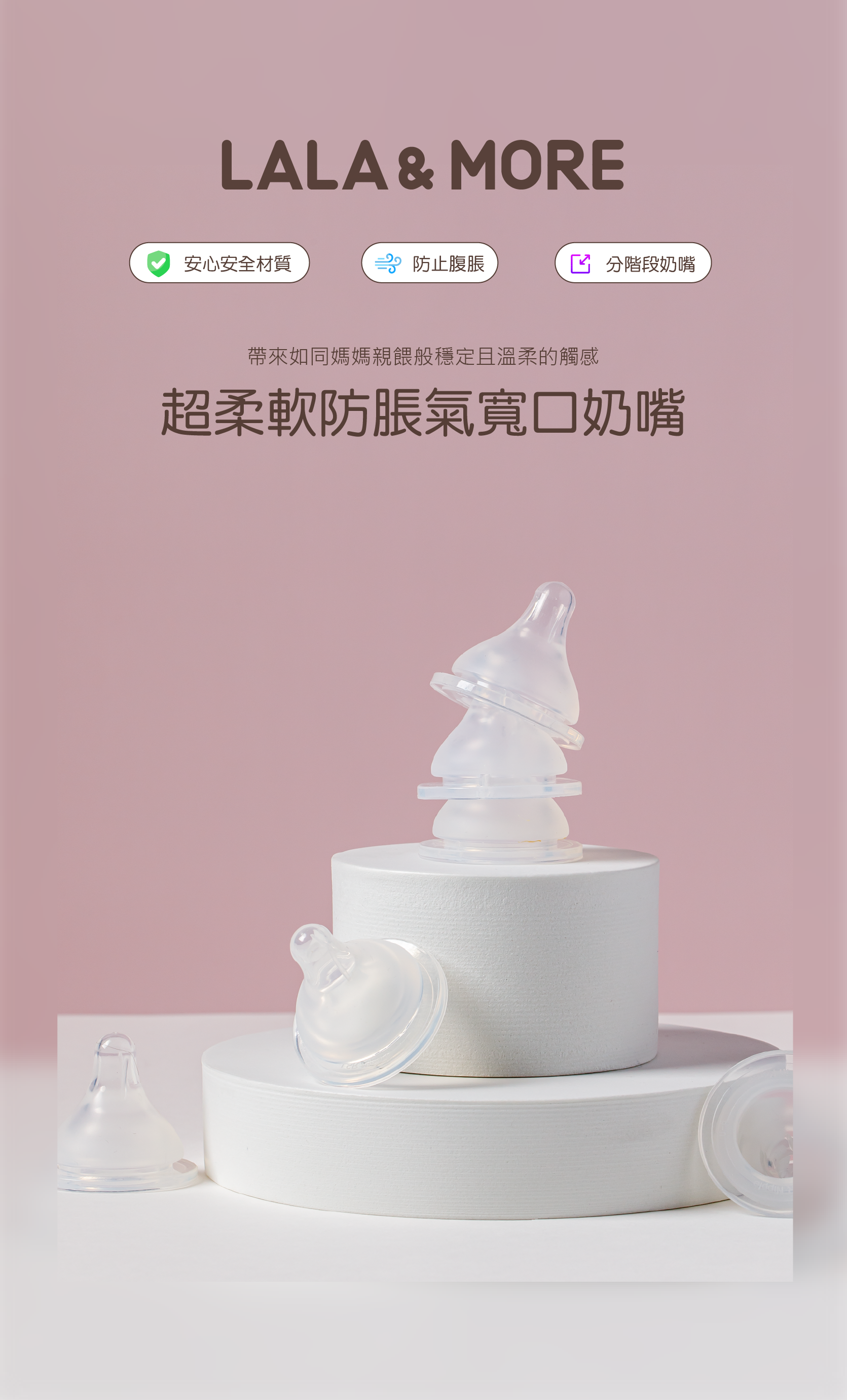 商品名稱| LALA&MORE 超柔軟防脹氣寬口奶嘴-五階段