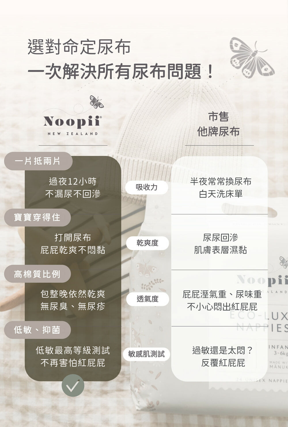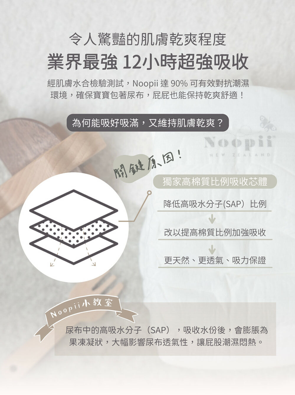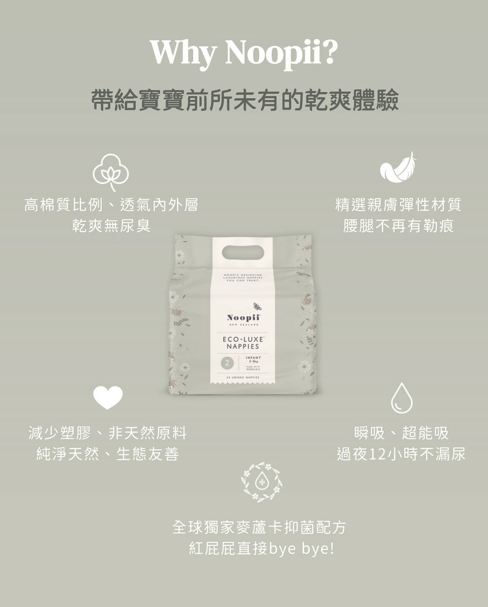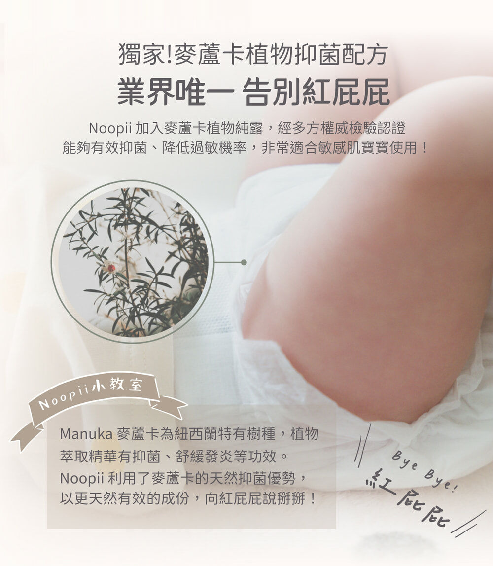 全球獨家添加麥蘆卡(Manuka)純露,搭配超吸水透氣材質,幫助寶寶遠離紅屁屁!