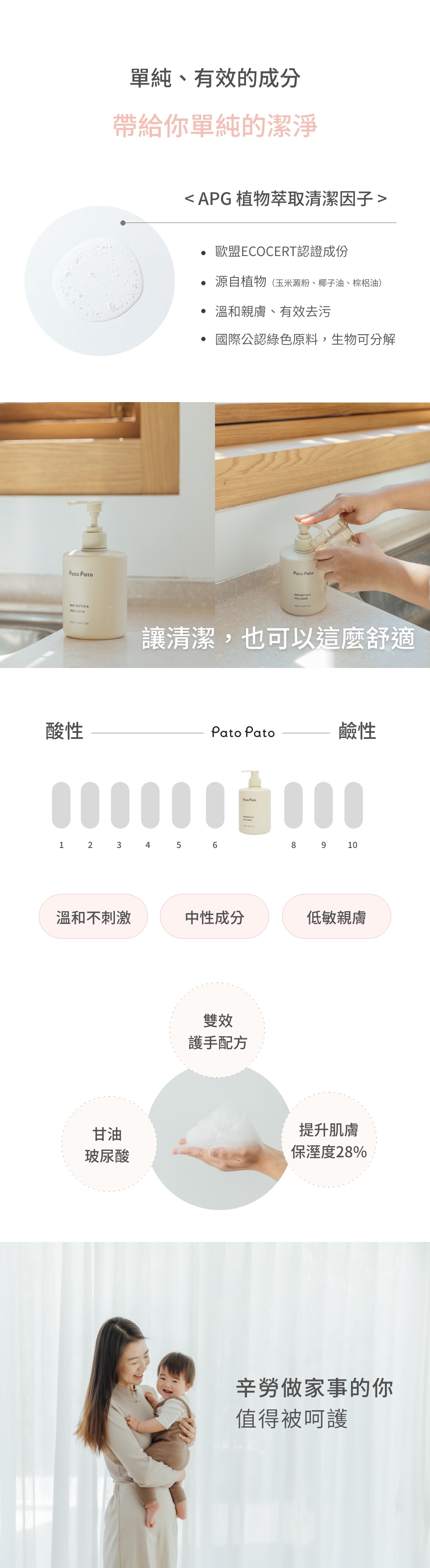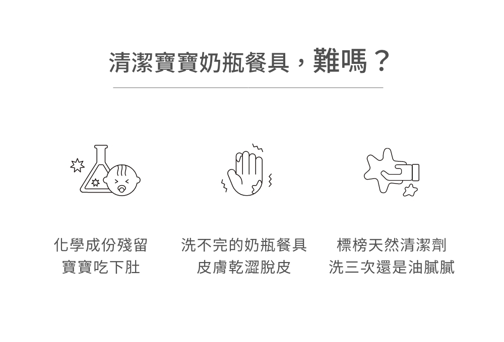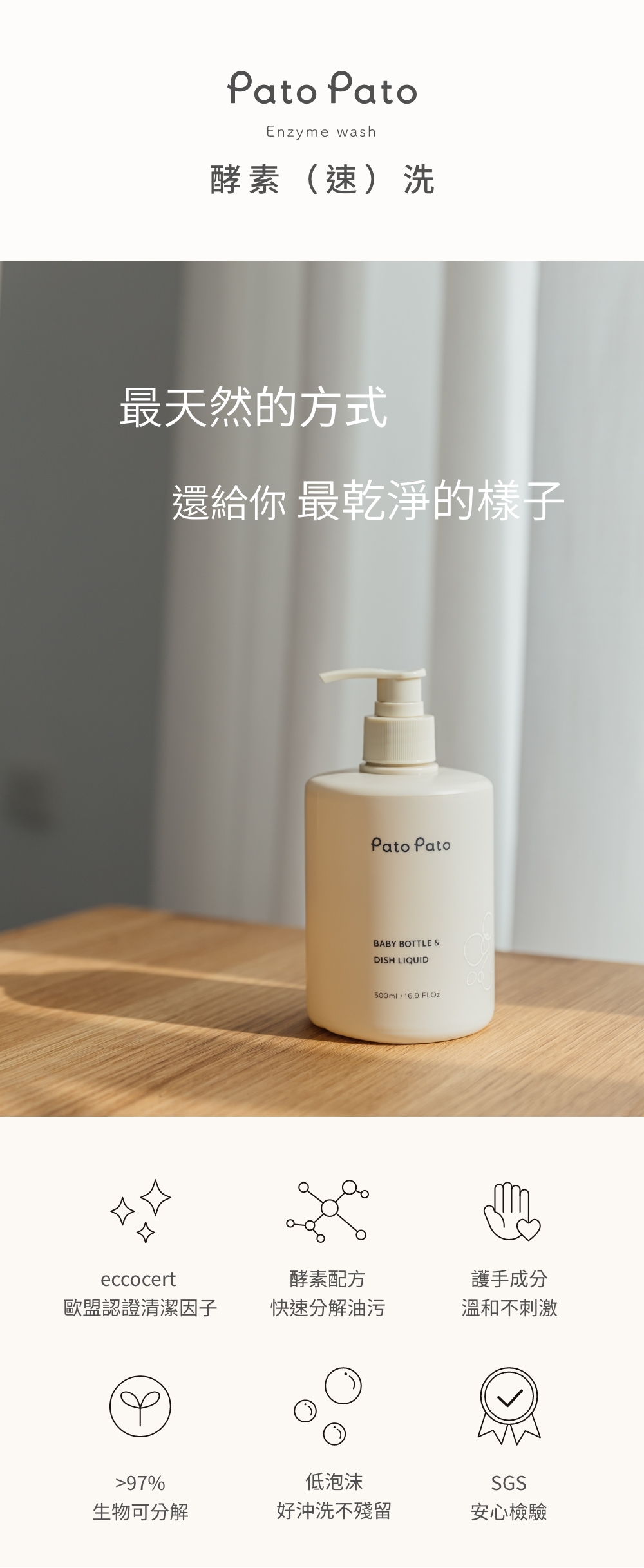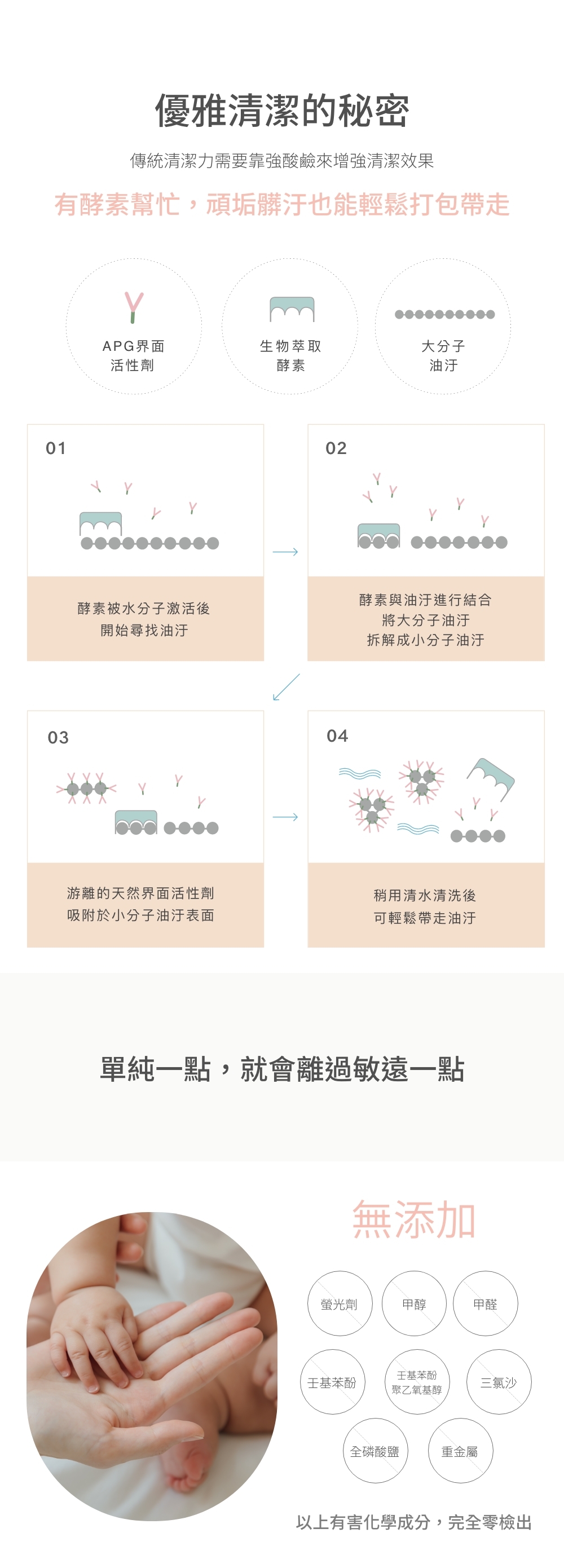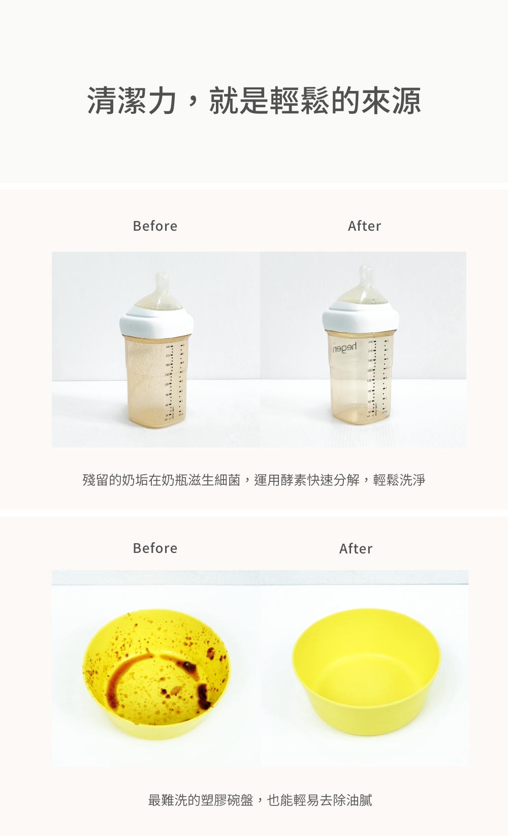 優雅清潔解方,專對付蛋白質、油脂,適合清潔奶瓶、餐具、接觸口腔的玩具、蔬果。