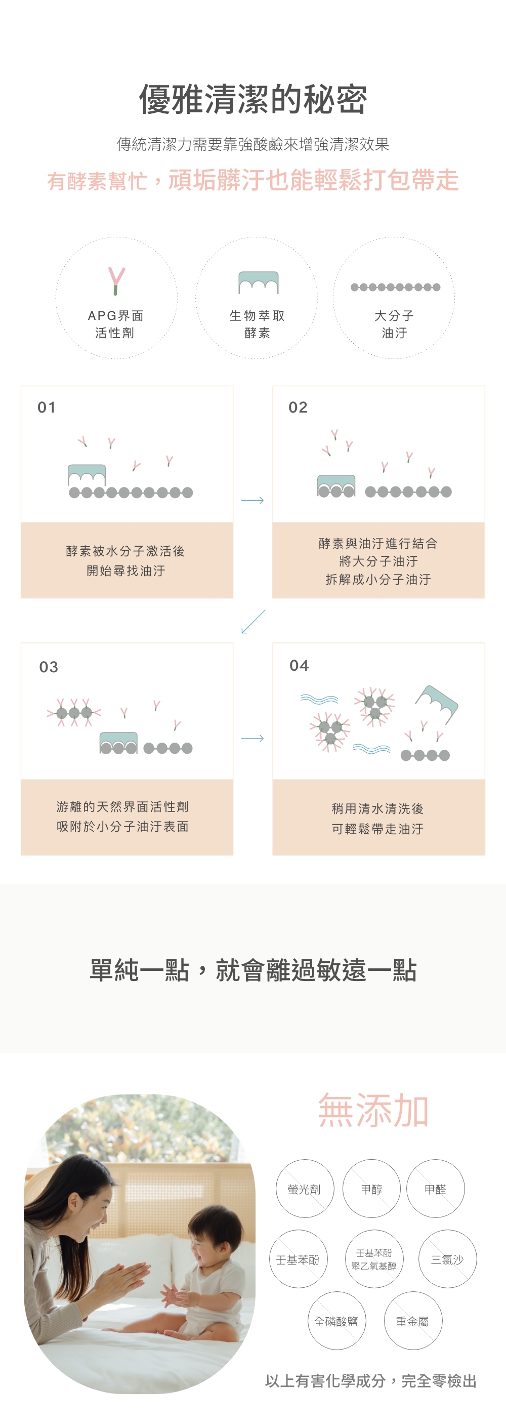 -無添加有害化學成分,好沖洗、不殘留,最單純的配方,全家碗盤一起洗也很安心。