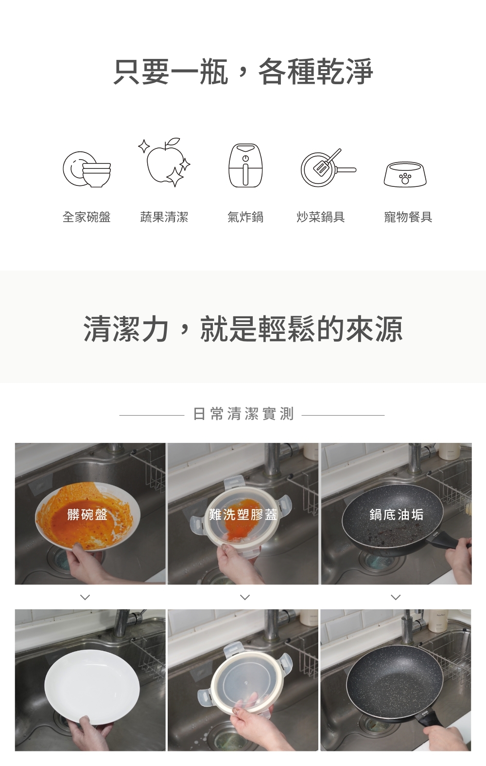 專去油膩髒汙,酵素配方,搭配嚴選天然植物萃取基底,可輕易分解鍋碗瓢盆油膩髒汙。