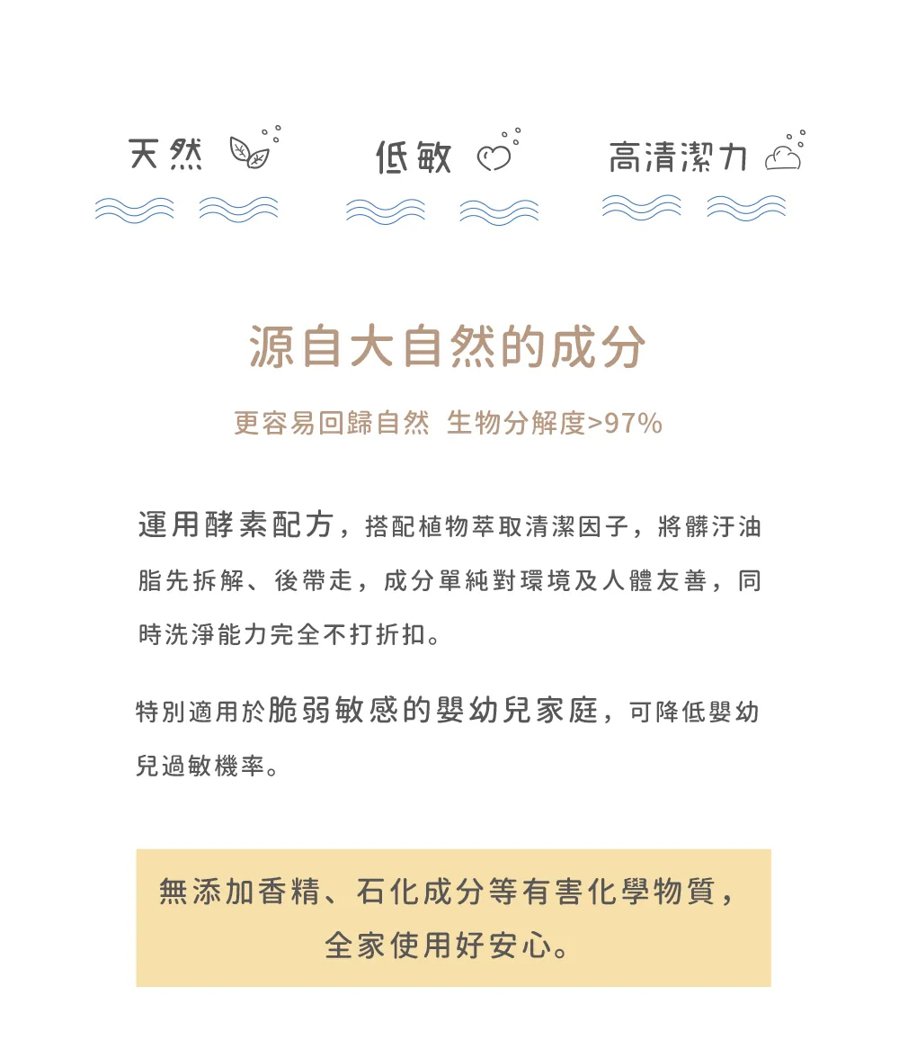 *運用酵素配方,搭配植物萃取因子,將髒汙油脂先拆解、後帶走,成分單純對環境及人體友善,同時洗淨能力完全不打折扣。