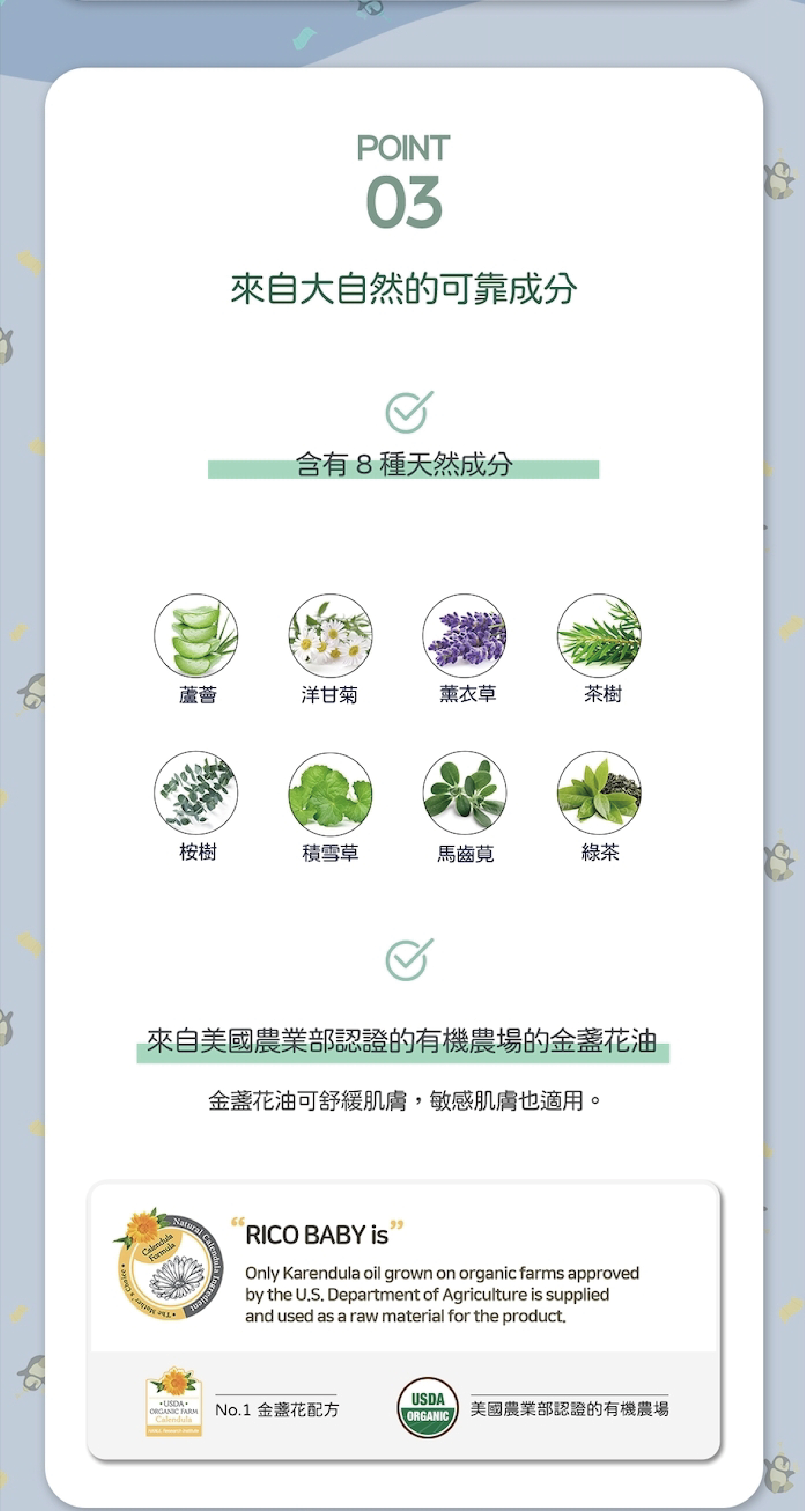 主要成分| 純水、金盞花萃取、蘆薈葉萃取、積雪草萃取、馬齒莧萃取、綠茶萃取、金盞花油、洋甘菊花油、橄欖油、薰衣草油、丙二醇、丁二醇、茶樹葉油、尤加利葉油、氫化卵磷脂、二丙二醇、神經醯胺NP、鞘糖脂、蔗糖二硬脂酸酯、膽固醇、辛二醇、乙基己基甘油、聚山梨醇酯-20、苯甲酸鈉(0.45%)、檸檬酸、1,2-己二醇