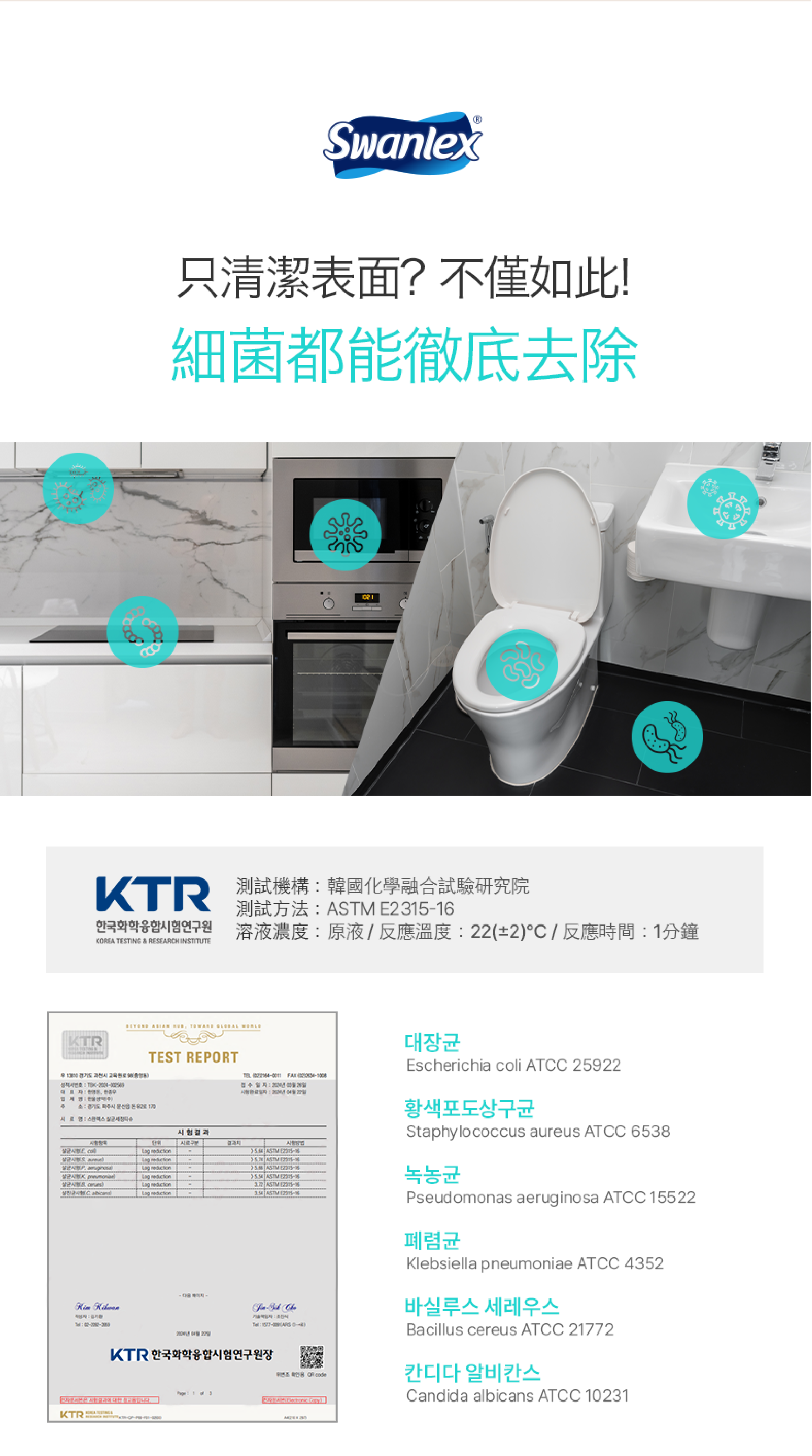 * 通過KTR韓國試驗研究院測試,能99.9%有效消除各種有害細菌