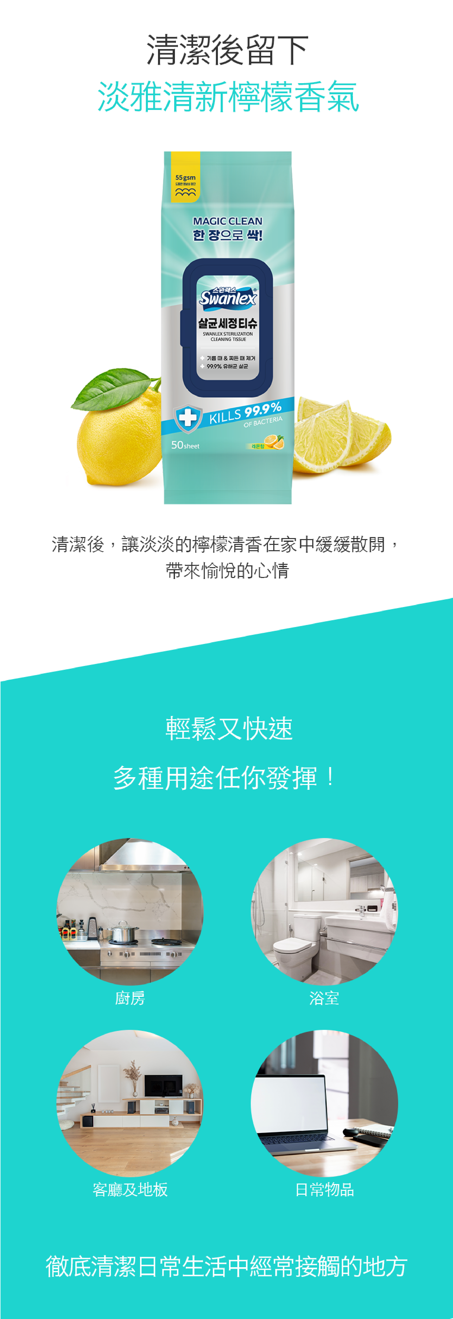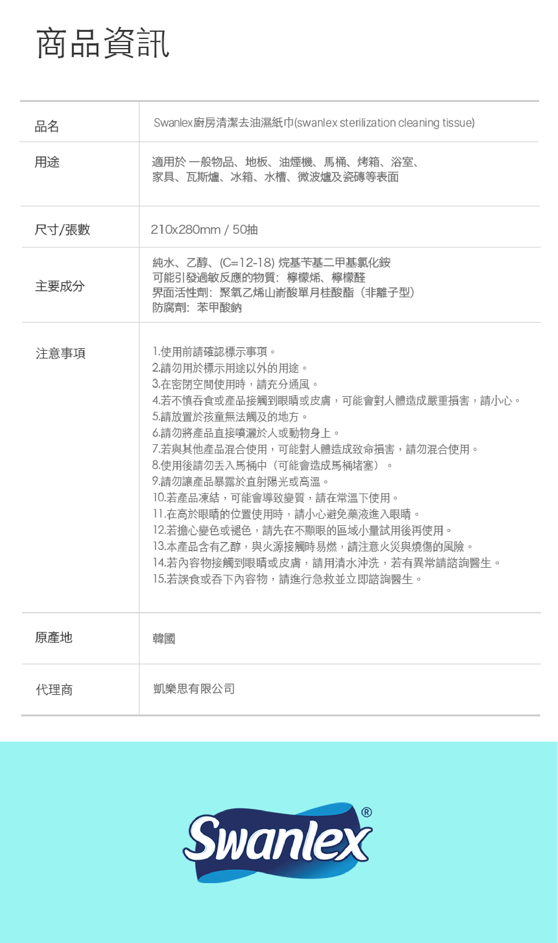商品名稱| Swanlex 廚房清潔去油濕紙巾 50抽